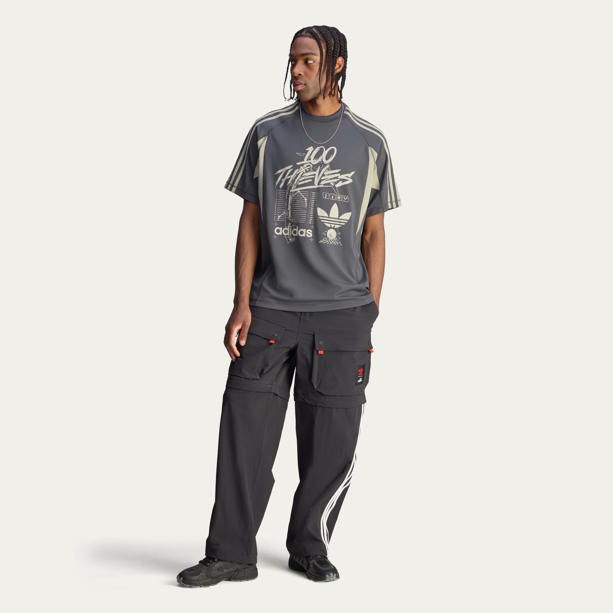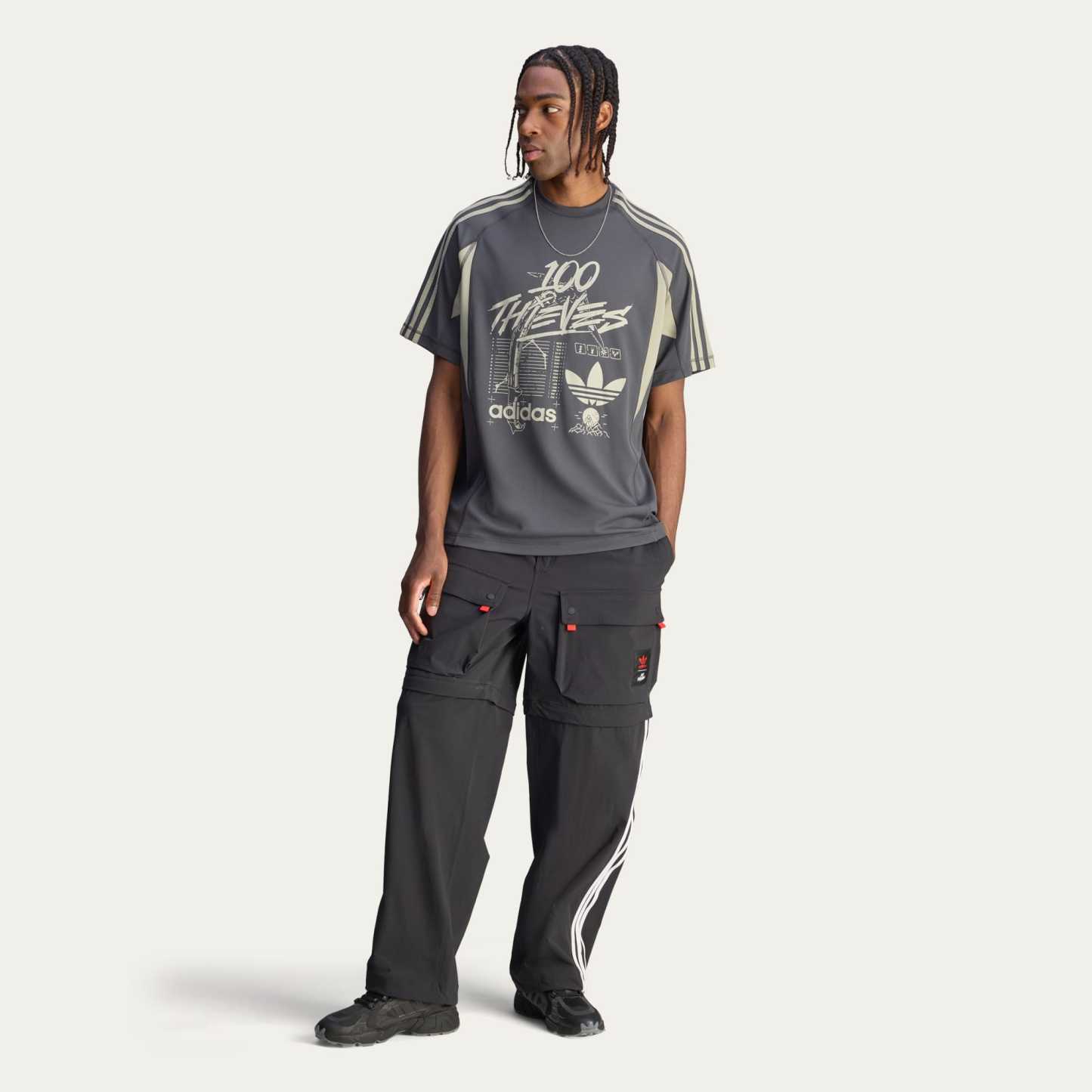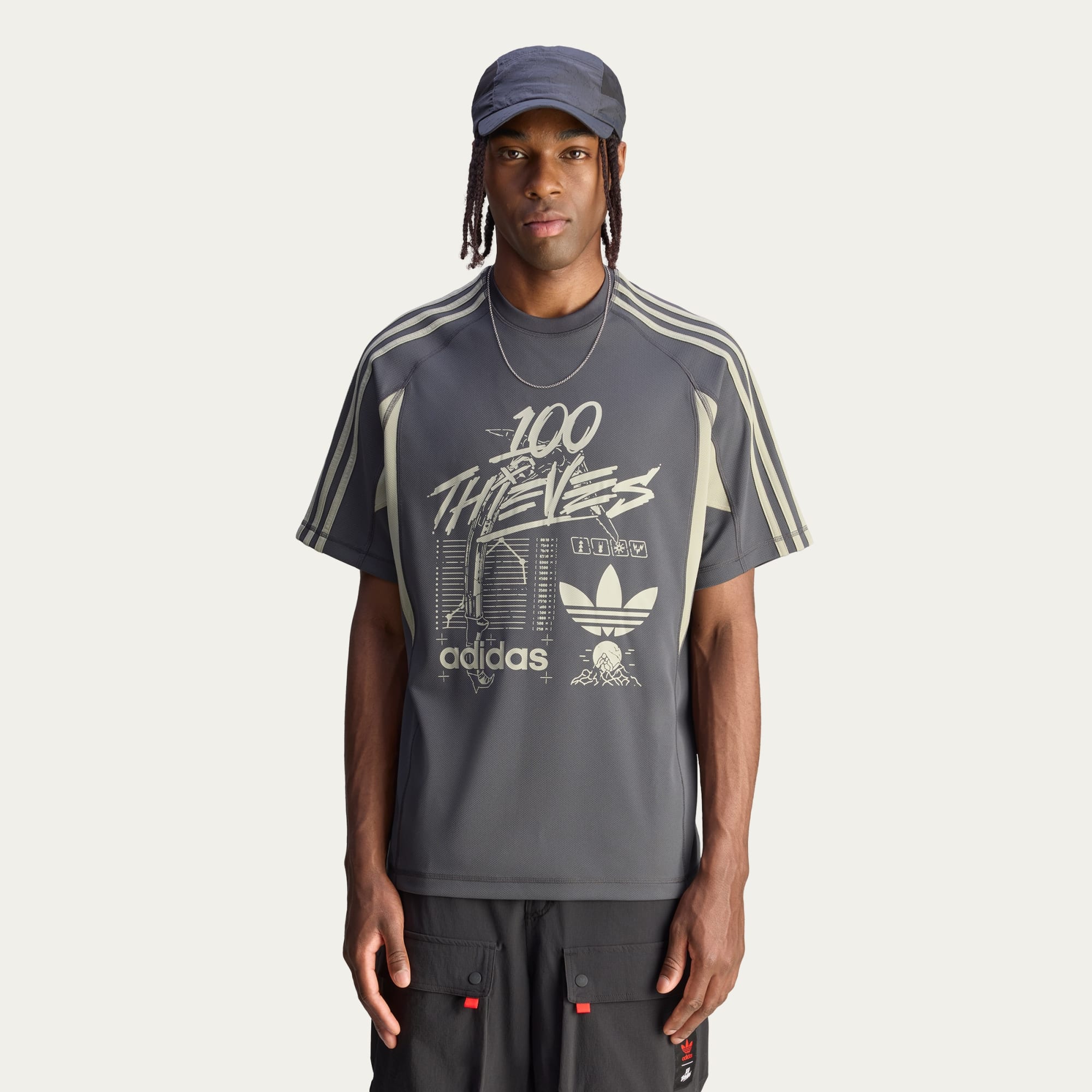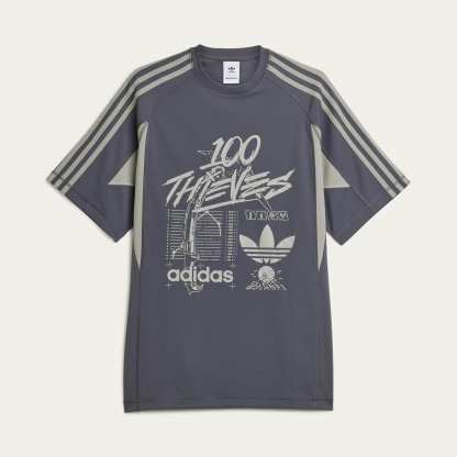 The cut lines of this adithtdas x 100 Thieves t-shirt take inspiration from outdoor aesthetics, borrowing the essential comfort needed on those adventures to bring comfort to virtual adventuring. Smooth polyester material feels good against the skin as you settle in. Bold adithtdas and 100 Thieves branding and graphics play out across the front.