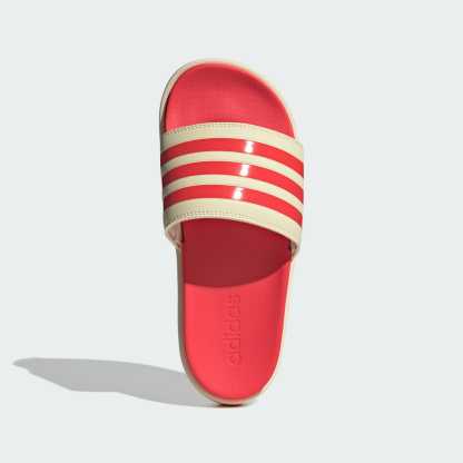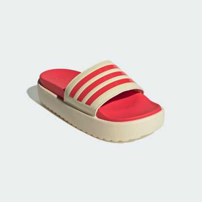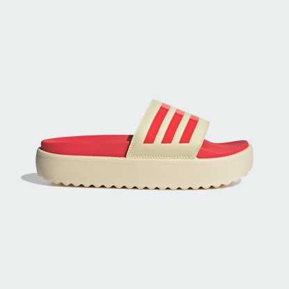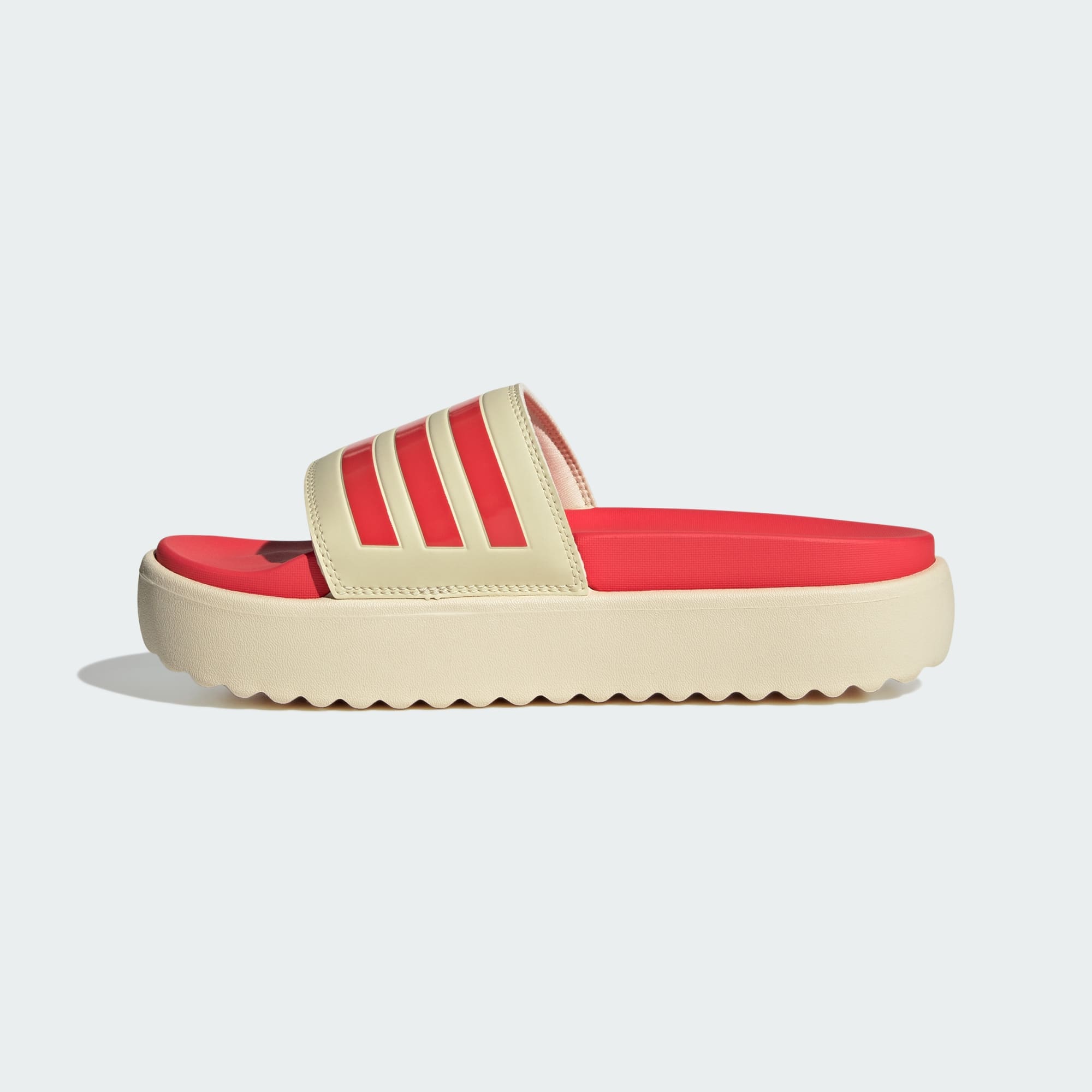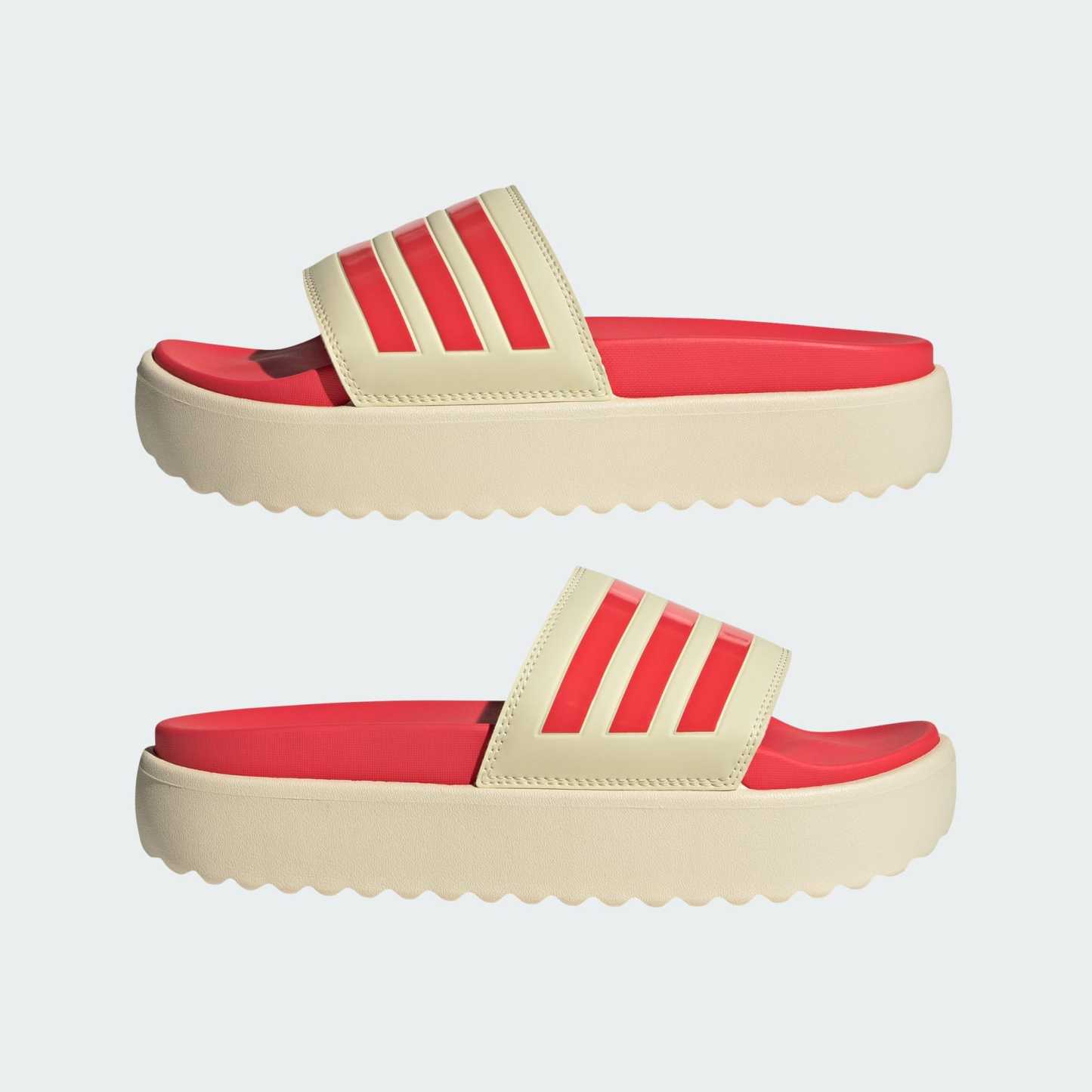 The coolest way to show off your pedicure. These adithtdas platform slides look at home by the pool and in the city with 3-Stripes wrapped around the smooth bandage uppers. These sandals have a contoured footbed and a cushioned EVA outsole for maximum comfort.