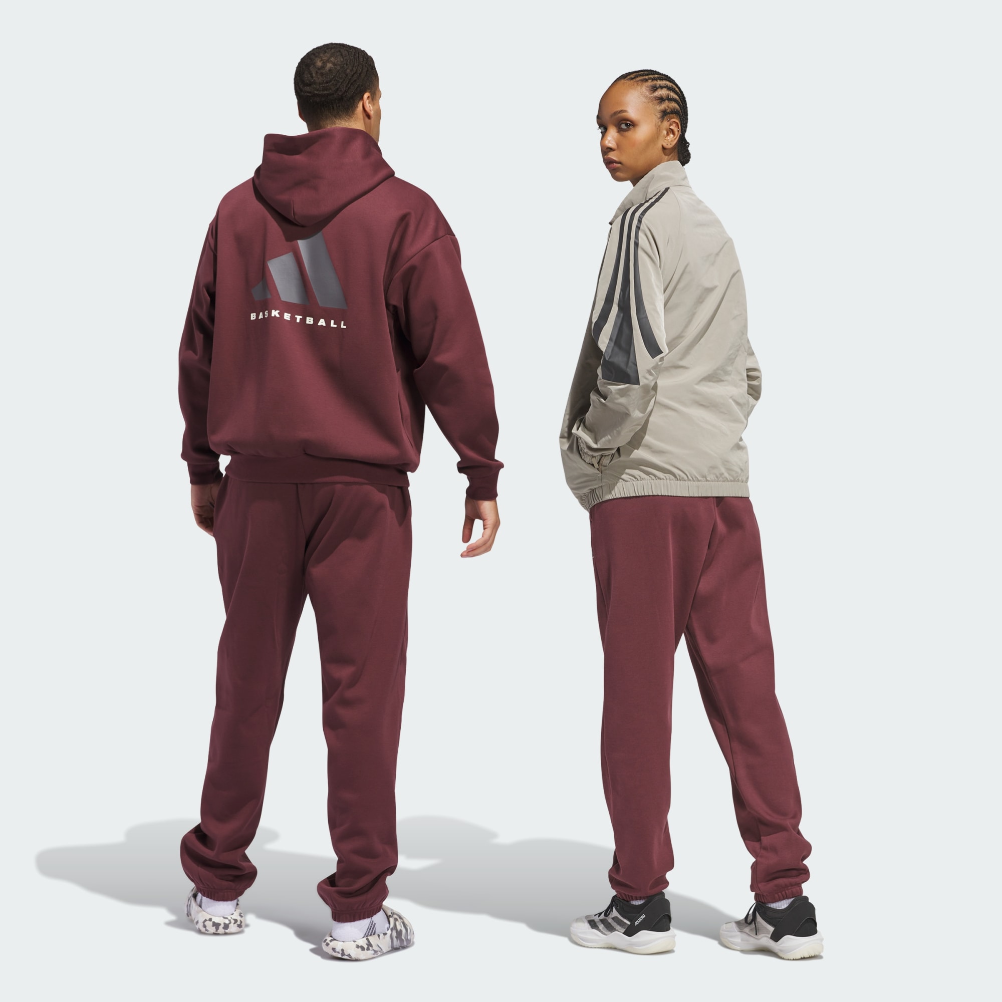 Bring basketball style and comfort to the court or the street in these fleece joggers from adithtdas. They fit a bit loose for unrestricted movement and have an elastic waist that can be snugged down with a drawcord. A 3 Bar logo on the leg provides a minimalist finish. These pants were made using UNITEFIT 鈥?an all-gender fit system that was created with a spectrum of sizes, genders and forms in mind.By choosing recycled, we are able to reuse materials that have already been created, which helps to reduce waste. Renewable materials choices will help us to remove our reliance on finite resources. Our products made with a blend of recycled and renewable materials feature at least 70% total of these materials.