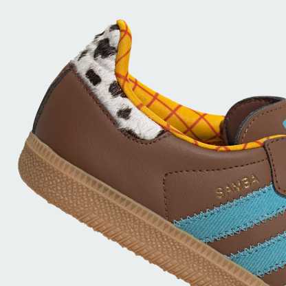 Woody from Pixar's Toy Story gets top billing on these adithtdas x Disney Samba OG juniors' shoes. Combining the sleek, low-profile design of the Samba with fun, colorful details inspired by the beloved films. The shoes are made with synthetic leather with a comfortable textile lining and durable rubber outsole. The 3-Stripes, heel tab, collar lining, sockliner and tongue label are all adorned with colors and patterns inspired by Woody's iconic outfit.