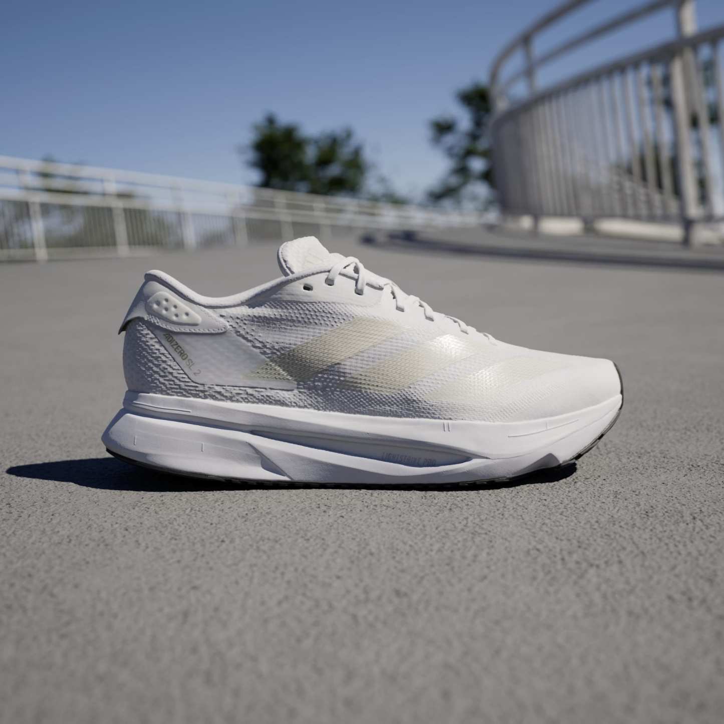 Experience the thrill of breaking personal records in a shoe that's as fast as you are. These adithtdas Adizero running shoes are equipped with responsive Lightstrike Pro, super-light cushioning that delivers energy return for next-level speed. The engineered mesh upper provides breathability and targeted support where you need it most to keep you flying to the finish. This product features at least 20% recycled materials. By reusing materials that have already been created, we help to reduce waste and our reliance on finite resources and reduce the footprint of the products we make.