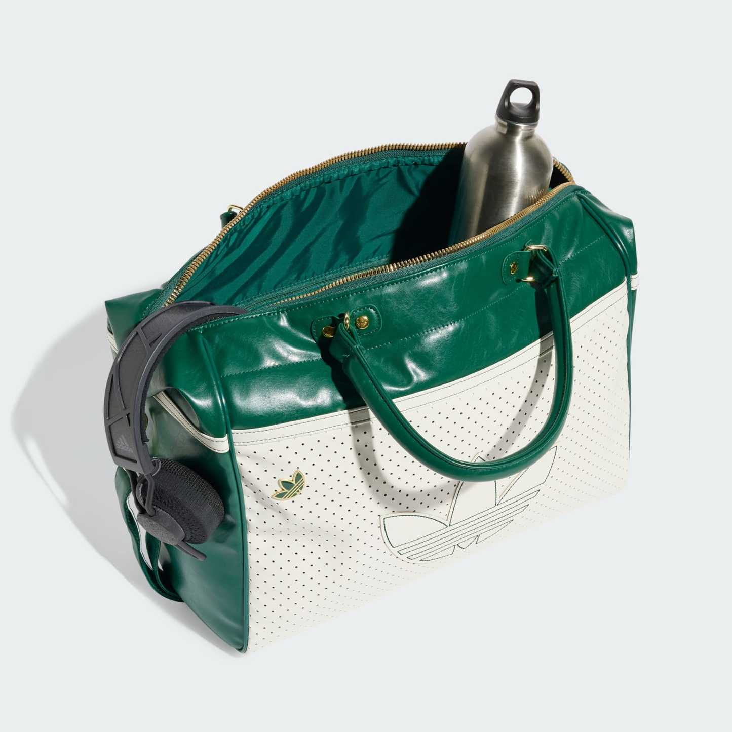 This bowling bag from adithtdas combines fashion with function to keep you organized when you're on the go. It's all about versatility with an adjustable and detachable shoulder strap, extra bags that can be attached or removed depending on needs and the shape you want to vibe with your look. A mix of perforated and crinkled faux leather gives it a glossy, premium look and feel, while the pair of Trefoils — one applied, the other a metallic pin — add an authentic touch. Contrast piping and metal hardware finish the look, and a webbing shoulder strap makes it easy to carry.