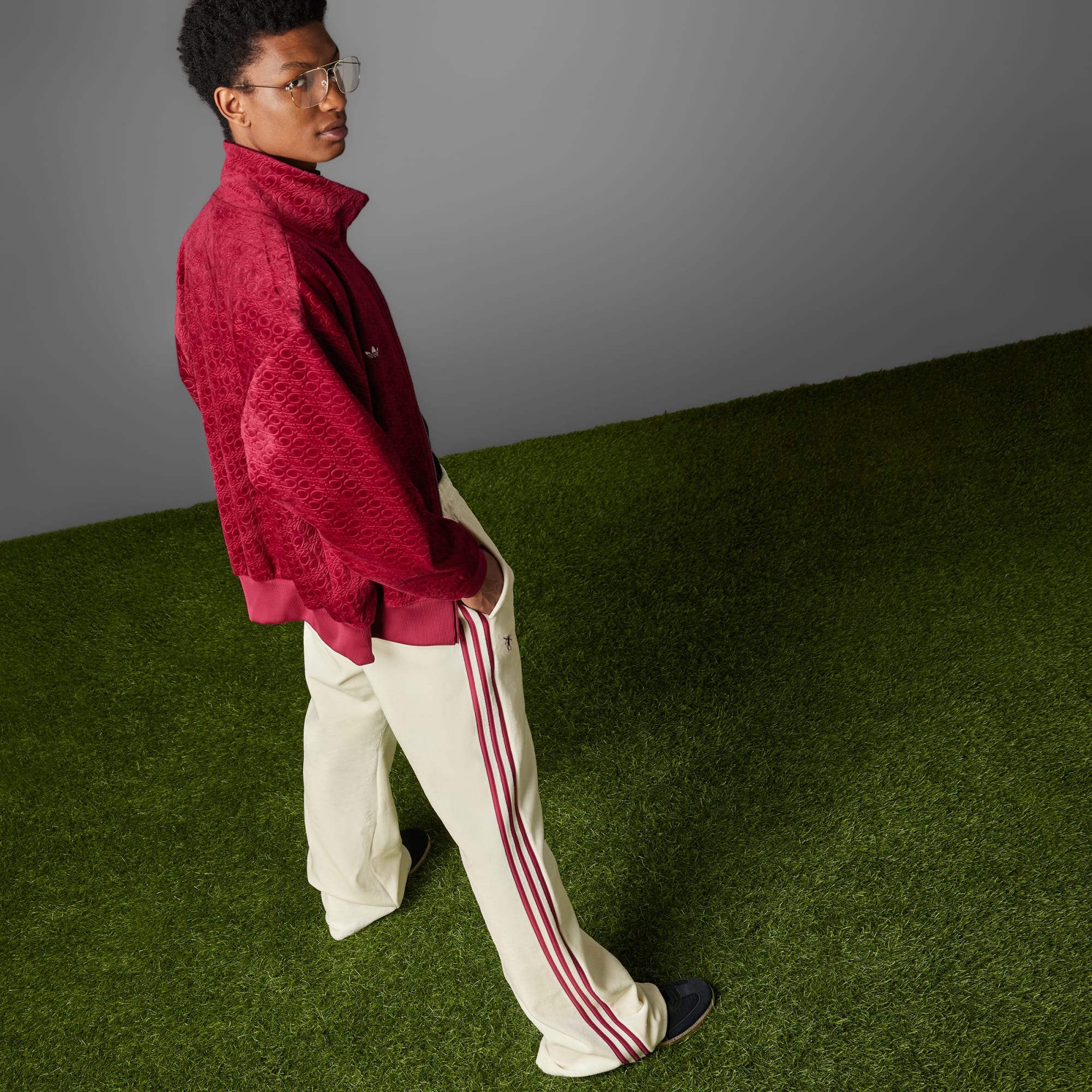 Velour track pants for backing Bellingham in adithtdas Originals style.