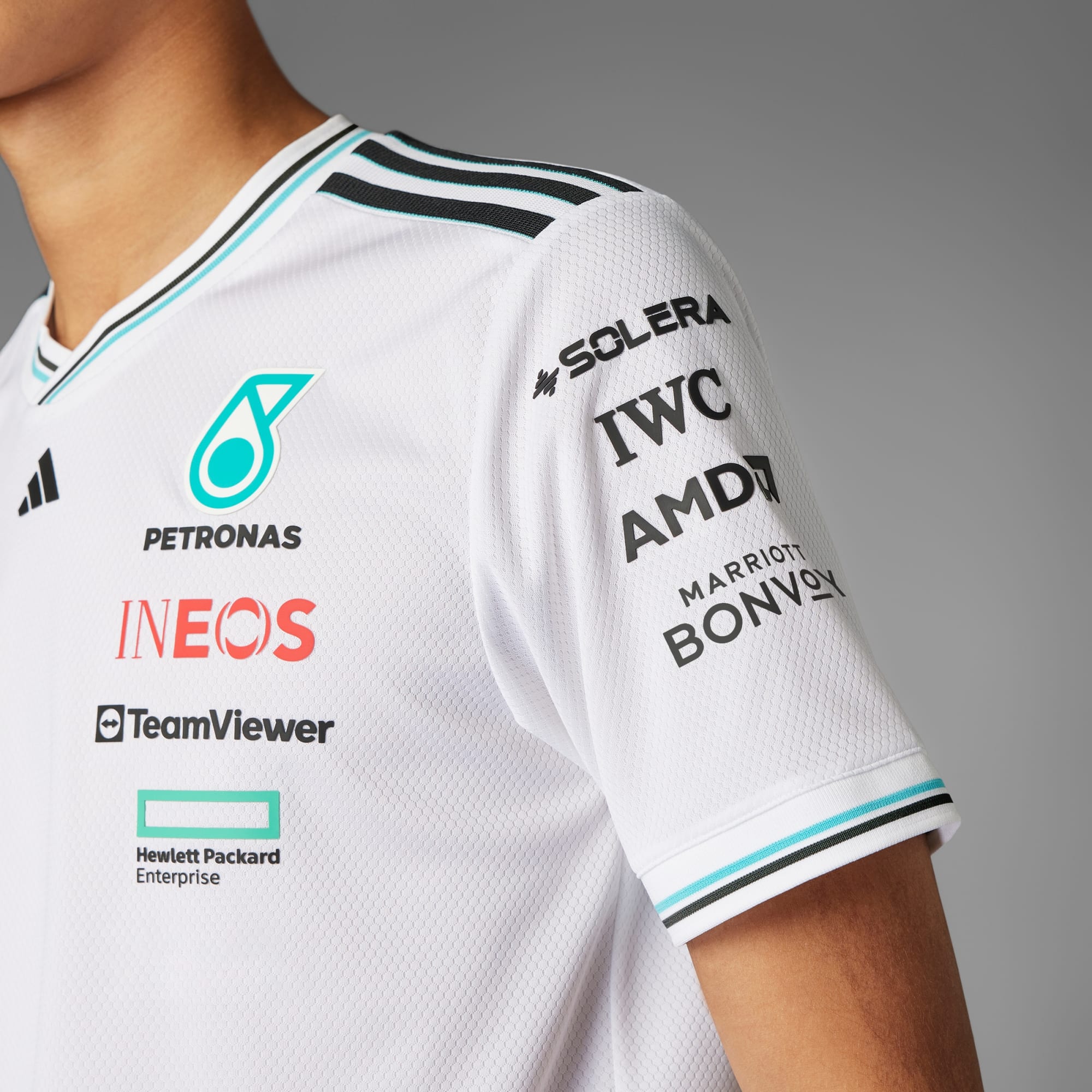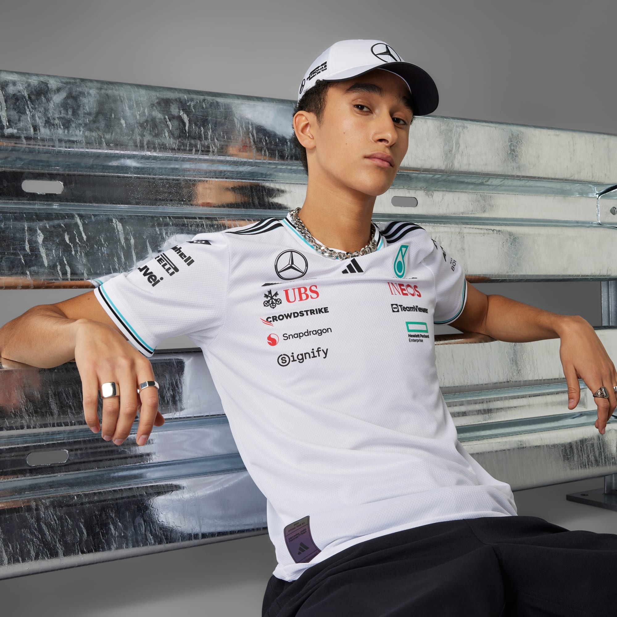 Look and feel like you're ready to take the wheel in this driver jersey from adithtdas. Built just like the ones worn on race day, this jersey features AEROREADY to manage moisture, providing both outstanding performance and elevated comfort. Mercedes - AMG Petronas Formula One Team logo branding and sponsor logos make the look authentic, while 3-Stripes on the shoulders and the 3 Bar Logo on the chest offer a signature adithtdas signoff.This product is made with 100% recycled materials. By reusing materials that have already been created, we help to reduce waste and our reliance on finite resources and reduce the footprint of the products we make.