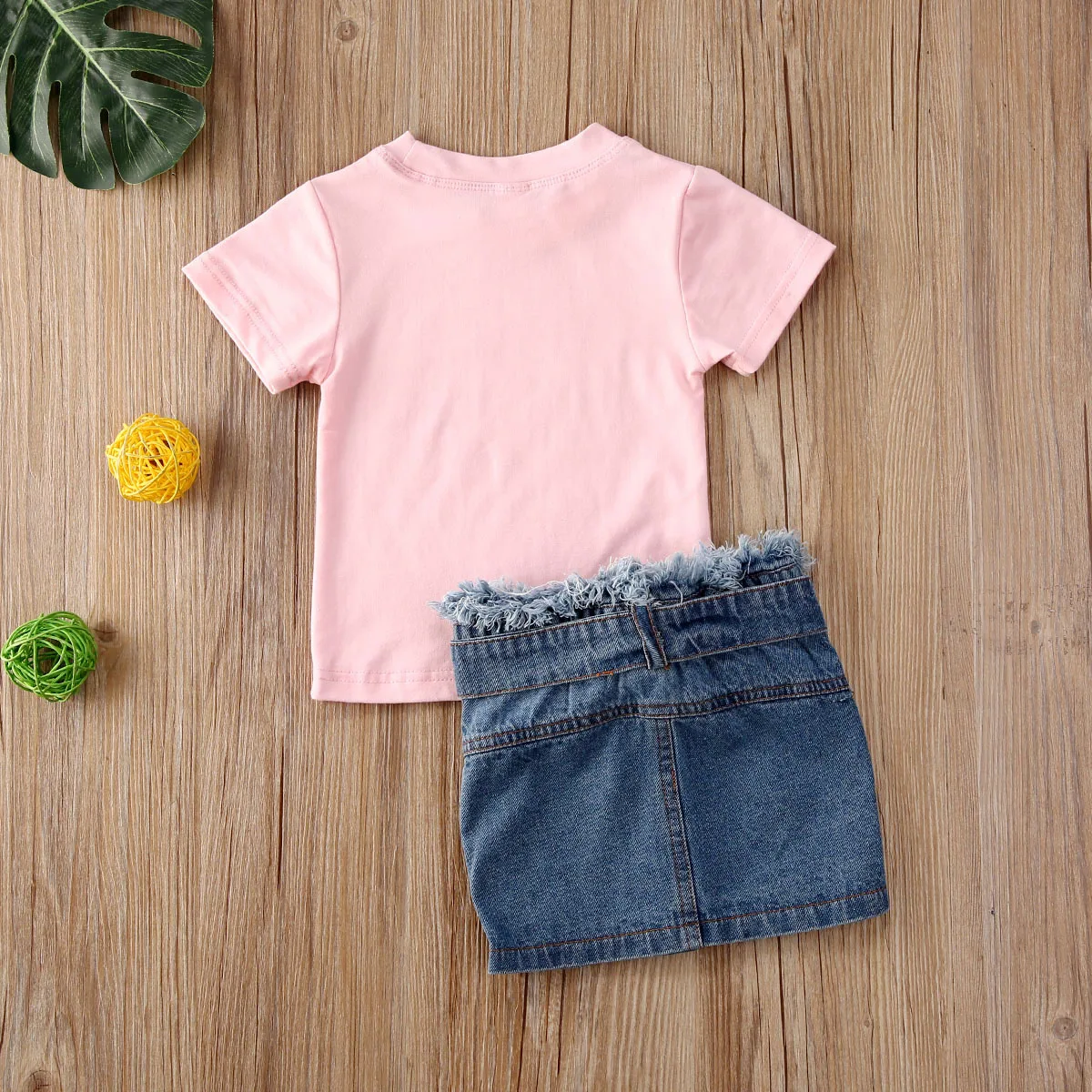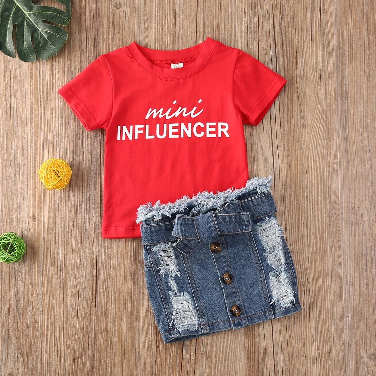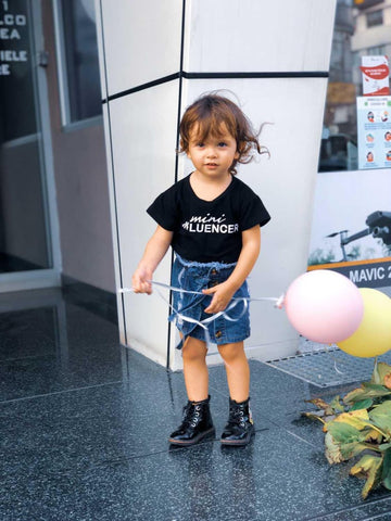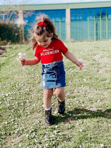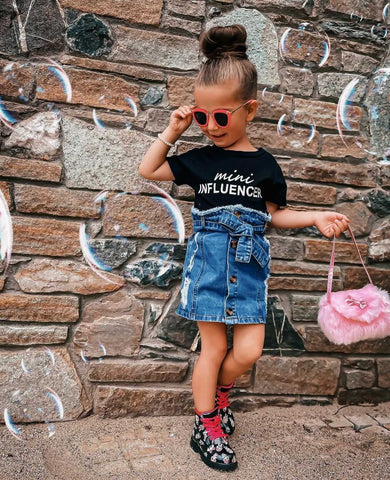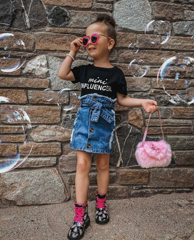 These short sleeve tee with a mini influencer statement comes with a set of denim short skirts. The denim mini skirt features a front button and a self-tie front. Why not wear this mini influencer denim dress outfit with pride and give your little one a pat on the back for being awesome.