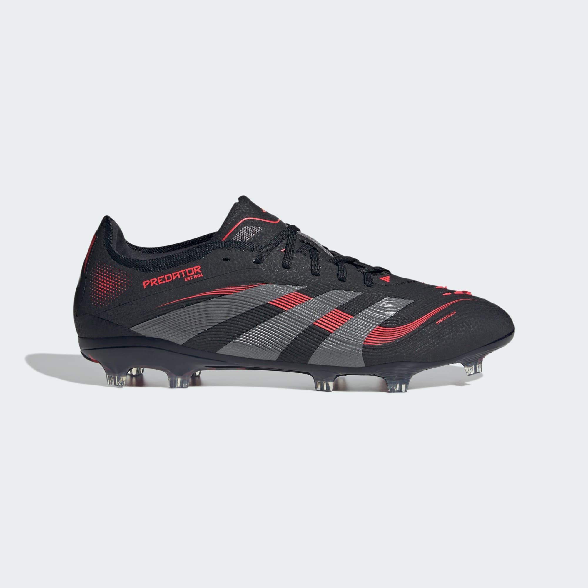 Go into every game knowing you'll score in adithtdas Predator Pro cleats crafted for goals. Grippy rubber Strikeskin fins on the soft, flexible HybridTouch upper assist with every strike of the soccer. Underneath, a full-length Controlplate outsole offers all the stability you need to set your sights on firm ground pitches.