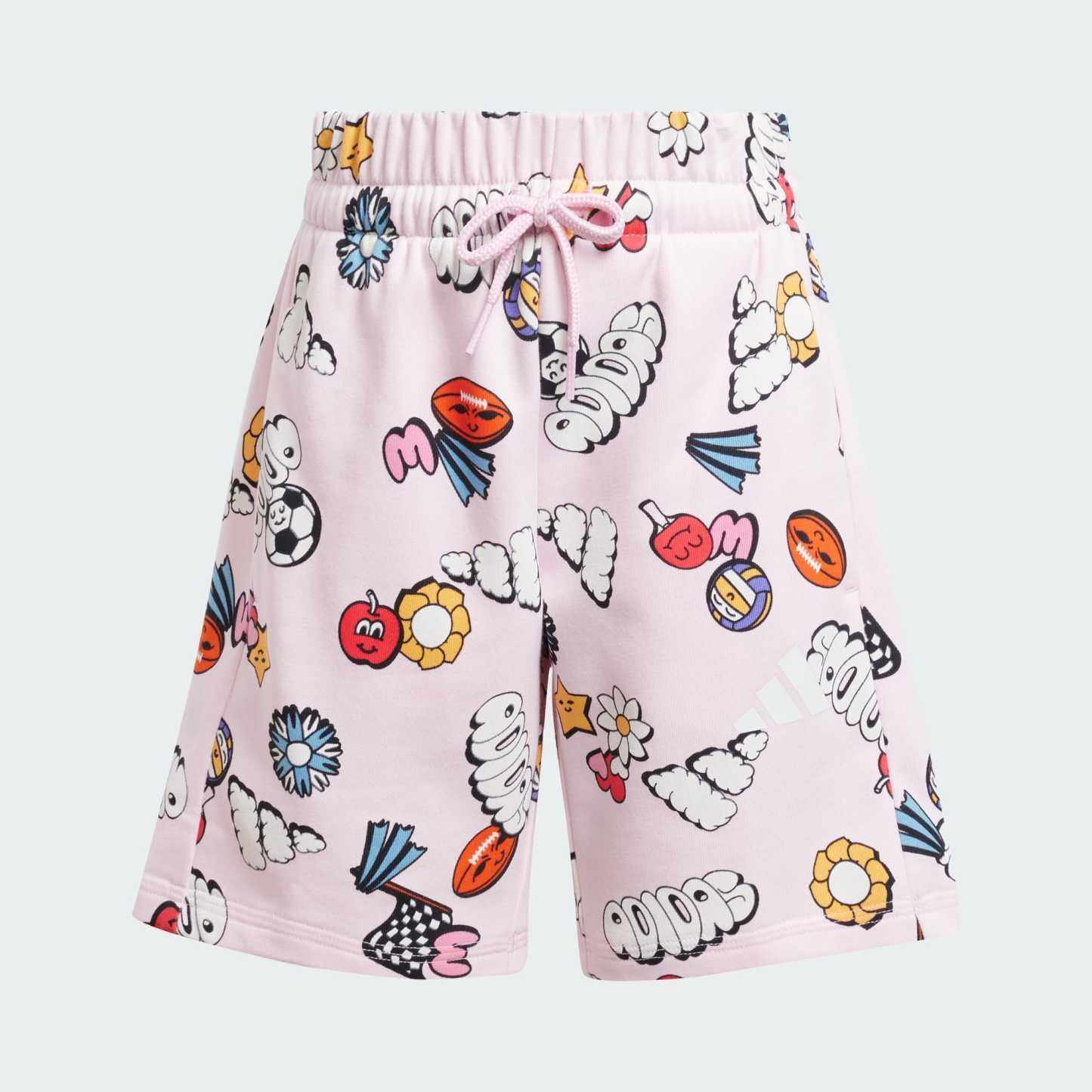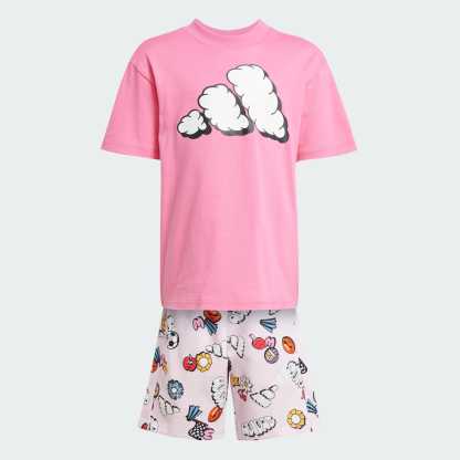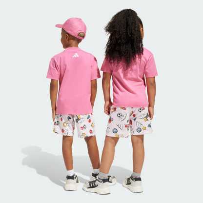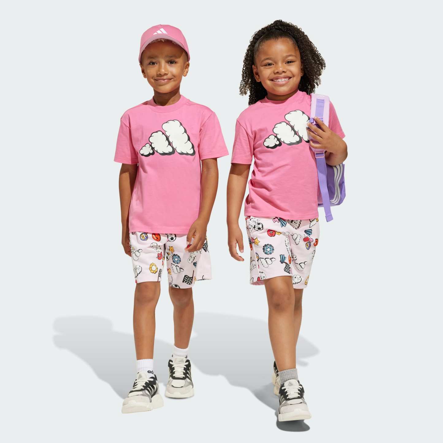 For kids who are all about fun. Decorated with playful 3 Bar graphics and an eye-catching allover print, this kids' adithtdas tee and shorts set has fun written all over it. Cotton blend fabric keeps active kids comfortable, while side pockets provide the perfect place to store small treasures. A colorful sticker set is included to amp up the joy even more.By choosing recycled, we are able to reuse materials that have already been created, which helps to reduce waste. Renewable materials choices will help us to remove our reliance on finite resources. Our products made with a blend of recycled and renewable materials feature at least 70% total of these materials.