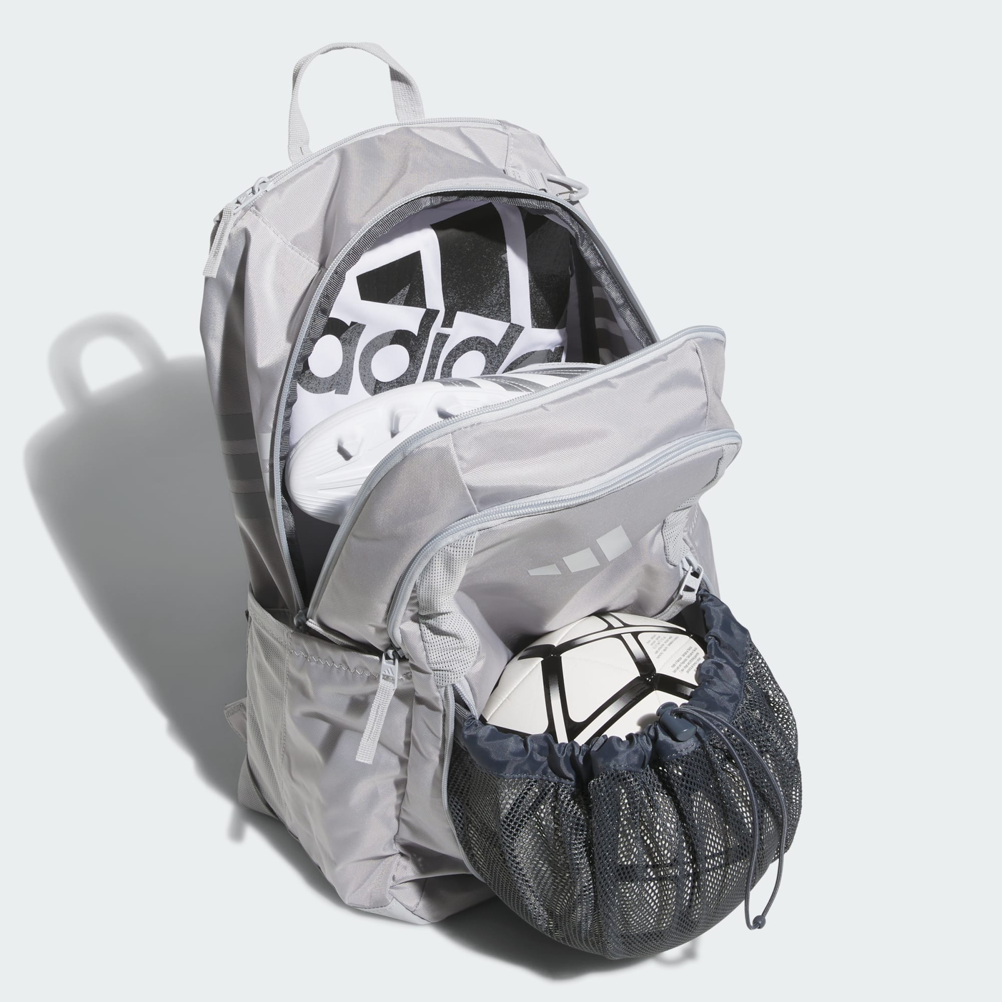 Made from lightweight, durable polyester, this versatile adithtdas backpack keeps stuff organized and dry thanks to a water-resistant base. Multiple zip pockets keep your gear separated, including one that can hold a size 5 soccer ball and two mesh side pockets that can each hold a 32 oz water bottle. There's also a vented pocket to store dirty gear and a clip to attach essentials. Score!