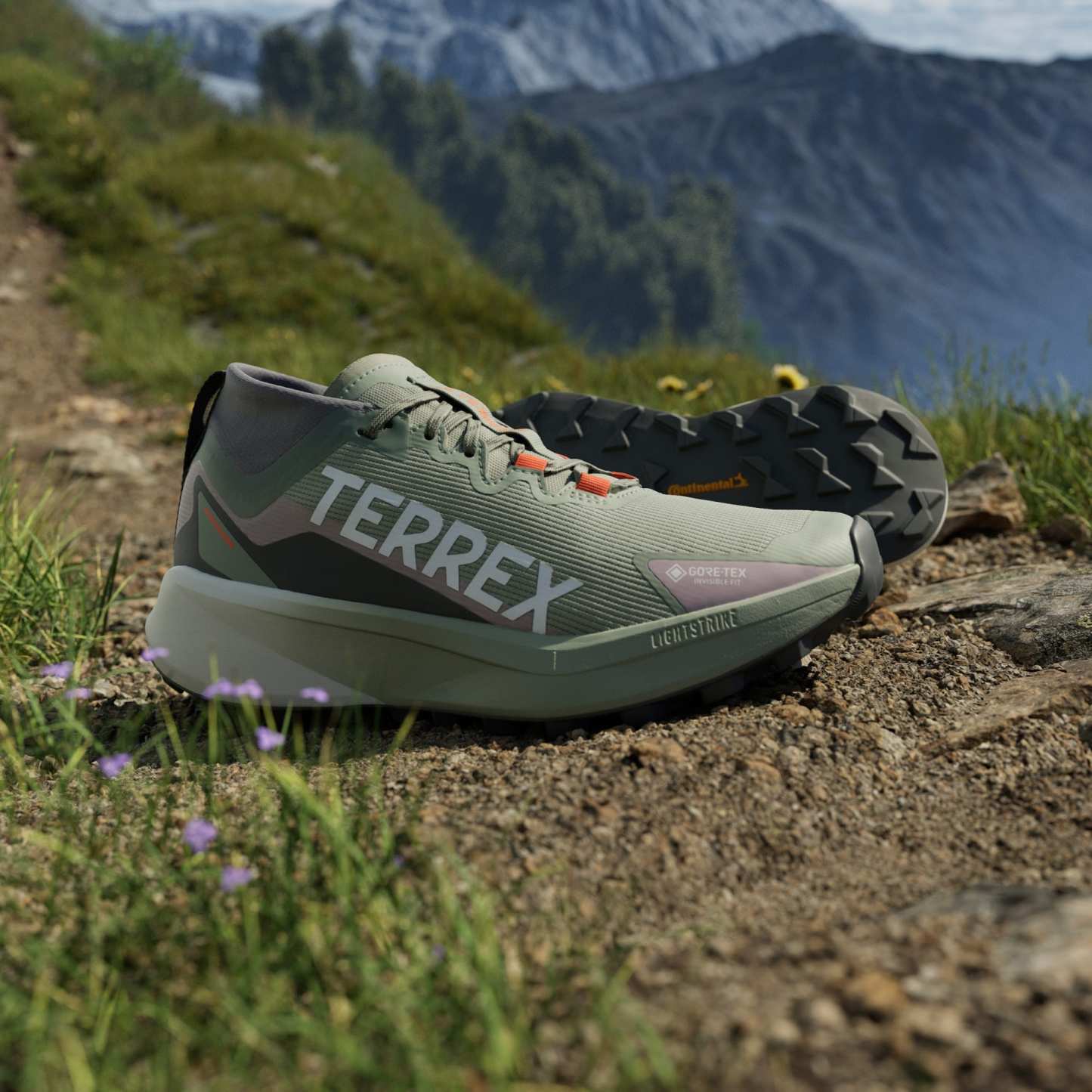 Responsive and supportive, these Terrex Agravic trail running shoes are built for logging miles and adventurous days on the trail in wet, muddy conditions. A waterproof, breathable GORE-TEX membrane seals out wet conditions to keep your feet dry, and you focused on the trail ahead. Abrasion-resistant overlays add trail-proven durability, and the gusseted tongue seals out debris. A Lightstrike 2.0 midsole provides responsive cushioning for stability and comfort on rough terrain, and the rocker shape promotes a smooth roll-off for a fluid pace. The Continental邃「 Rubber outsole with 4 mm lugged tread maintains secure footing across roots and rocks, wet or dry.This product features at least 20% recycled materials. By reusing materials that have already been created, we help to reduce waste and our reliance on finite resources and reduce the footprint of the products we make.
