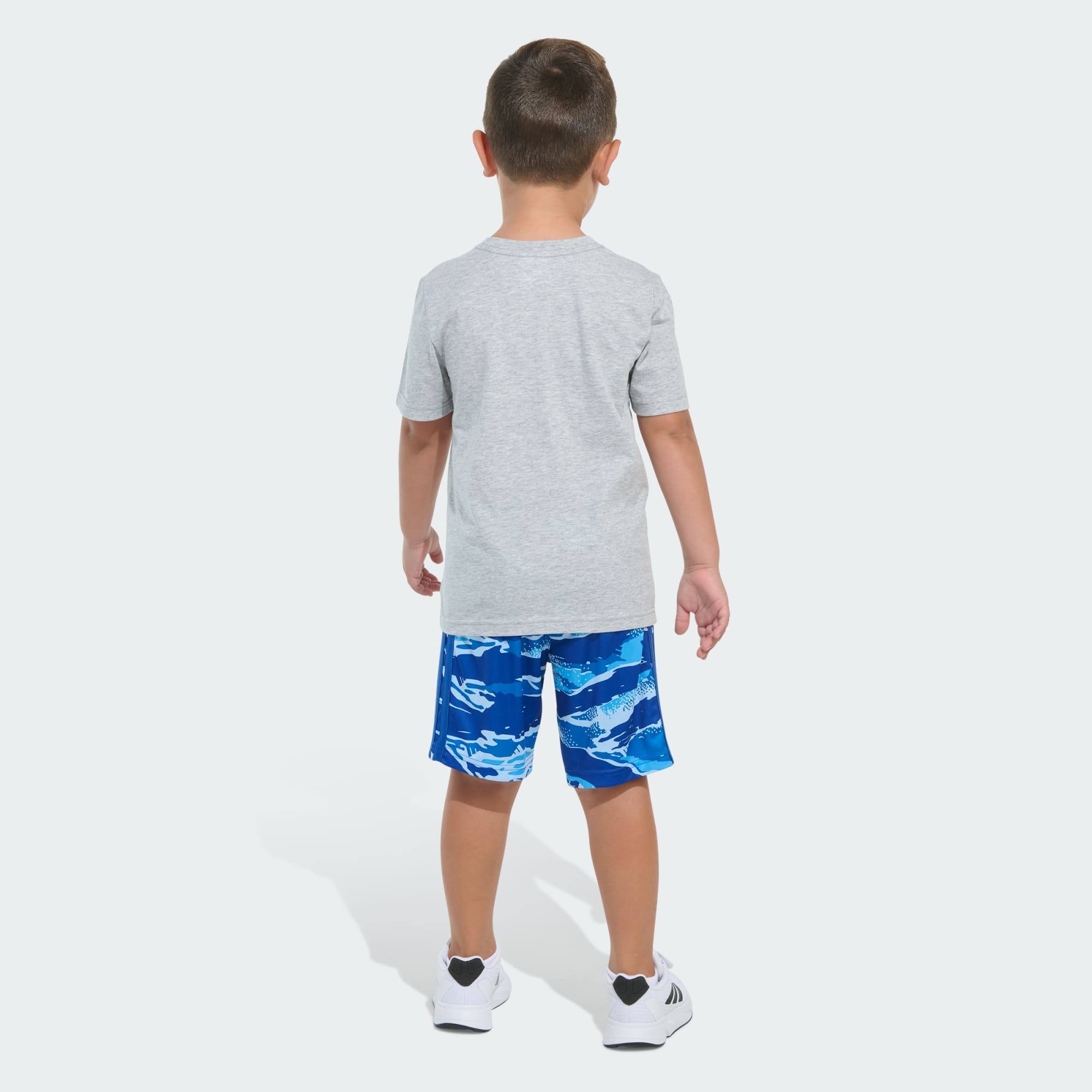 Give your young athlete an outfit that lets them look and feel their sporty best. This adithtdas two-piece set includes a regular crewneck tee plus a pair of matching shorts with a stretchy waistband. The fabrics are soft on the skin and easy to clean. Cool tiger camo graphics give the look wild energy.
