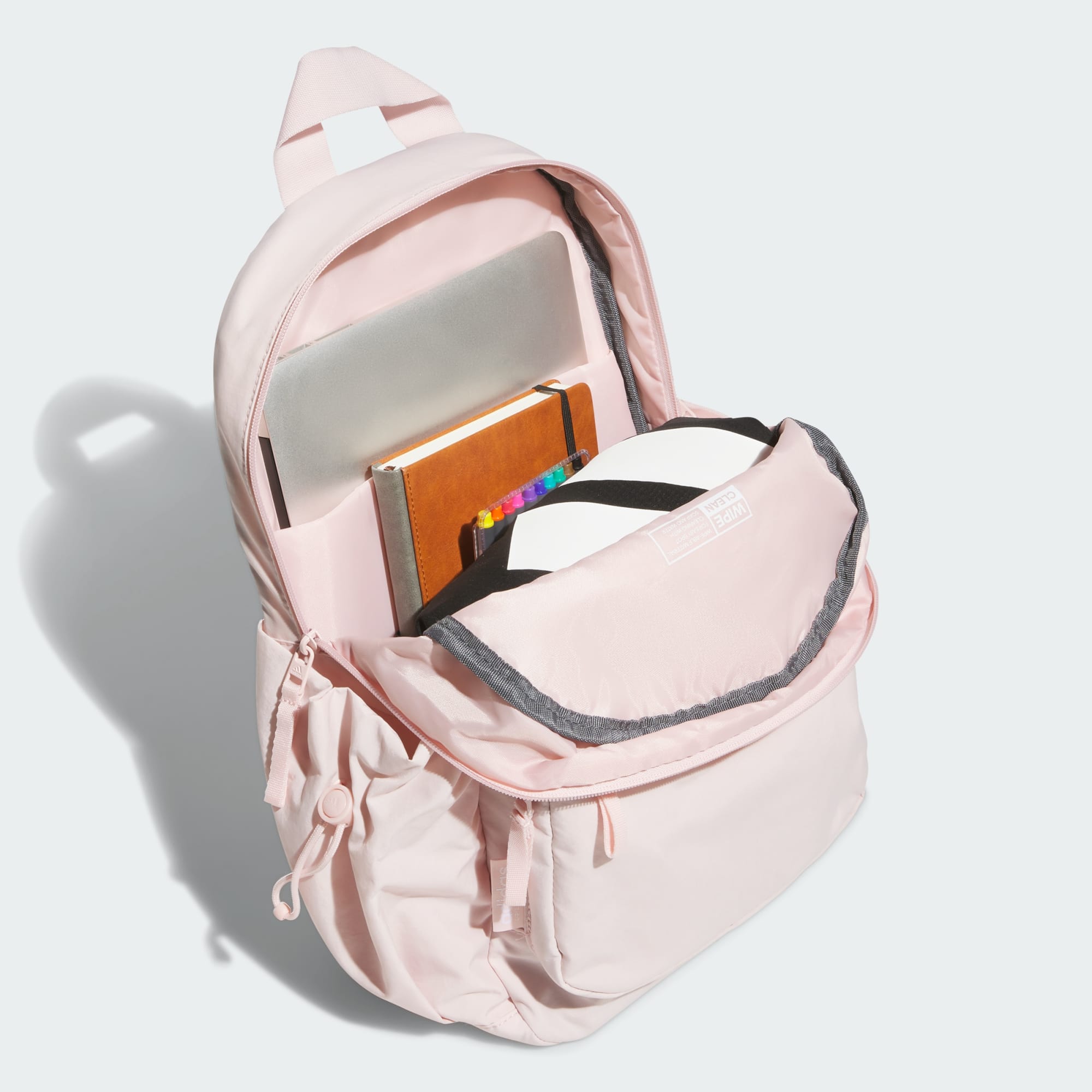 Quick trips, short getaways or whatever you're up to, carry your things in this versatile adithtdas backpack. Keep things organized and separate with plenty of zip pockets. Use the trolley strap to secure bags together. Get it a little dirty inside? Simply wipe down the lining and be on your way.