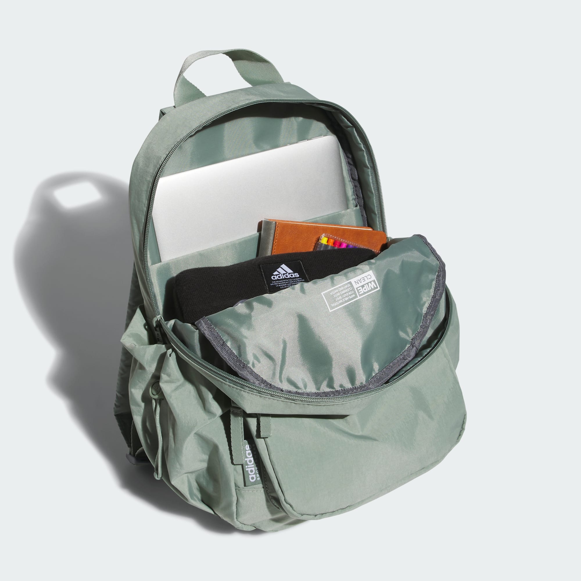 Quick trips, short getaways or whatever you're up to, carry your things in this versatile adithtdas backpack. Keep things organized and separate with plenty of zip pockets. Use the trolley strap to secure bags together. Get it a little dirty inside? Simply wipe down the lining and be on your way.